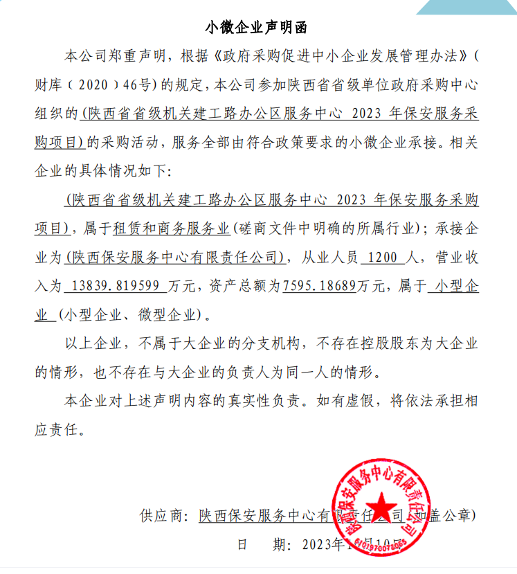----------------------------------招标机构发布信息原文:----------------------- 小微企业声明函.png 陕西省省级机关建工路办公区服务中心2023年保安服务采购项目.pdf 陕西省省级机关建工路办公区服务中心2023年保安服务采购项目中标(成交)明细.pdf 97c875f0-9460-447c-b394-ef1864fd45f4报价明细.pdf 十一、其他事项: ------------------------------------招标信息结束---------------------------- 标签: 项目 中标 采购 陕西省 建工 保安 服务中心 上一篇: 2023年10月13日2023年度省级公益性地质勘查项目(第二批)结果公告 最新5000条招标信息列表: 滚动招标 |