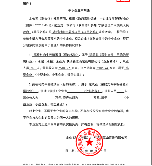 ----------------------------------招标机构发布信息原文:----------------------- 中小企业声明函.png 013-磋商文件.doc 宁陕县江口镇人民政府高桥村肉牛养殖项目中标(成交)明细.pdf 十一、其他事项: ------------------------------------招标信息结束---------------------------- 标签: 中标 项目 肉牛 高桥 公告 上一篇: 2023年10月18日山东省教育招生考试院南楼视频监控设备项目中标(成交)公告 最新5000条招标信息列表: 滚动招标 |