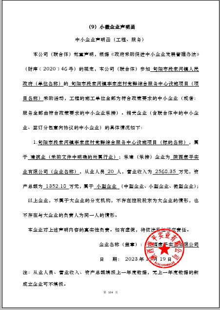 ----------------------------------招标机构发布信息原文:----------------------- 旬阳段家河项目磋商文件.docx 旬阳市财政局段家河财政所旬阳市段家河镇李家庄村党群综合服务中心设施项目中标(成交)明细.pdf 中小企业声明函(康平实业).png 十一、其他事项: ------------------------------------招标信息结束---------------------------- 标签: 项目 旬阳 党群 李家 庄村 服务中心 设施 上一篇: 2023年10月20日眉山江口沉银博物馆核心业务板块咨询服务采购项目中标(成交)结果公告 最新5000条招标信息列表: 滚动招标 |