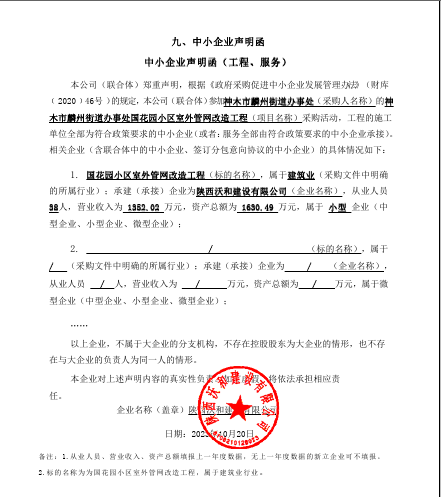 ----------------------------------招标机构发布信息原文:----------------------- 国花园小区室外管网工程磋商文件(2023100702).zip 神木市麟州街道办事处国花园小区室外管网工程中标(成交)明细.pdf 中小企业声明函.jpg 十一、其他事项: ------------------------------------招标信息结束---------------------------- 标签: 中标 神木 国花 管网 室外 街道办事处 改造工程 上一篇: 2023年10月24日枣强县王均乡人民政府2023年农村公益事业中央(省级)奖补资金项目(王均乡刘进伯村)成交结果公告 最新5000条招标信息列表: 滚动招标 |