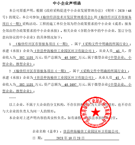 2023年10月24日榆佳经济技术开发区管理委员会榆佳经开区市容服务项目(一期)中标(成交)结果公告 |