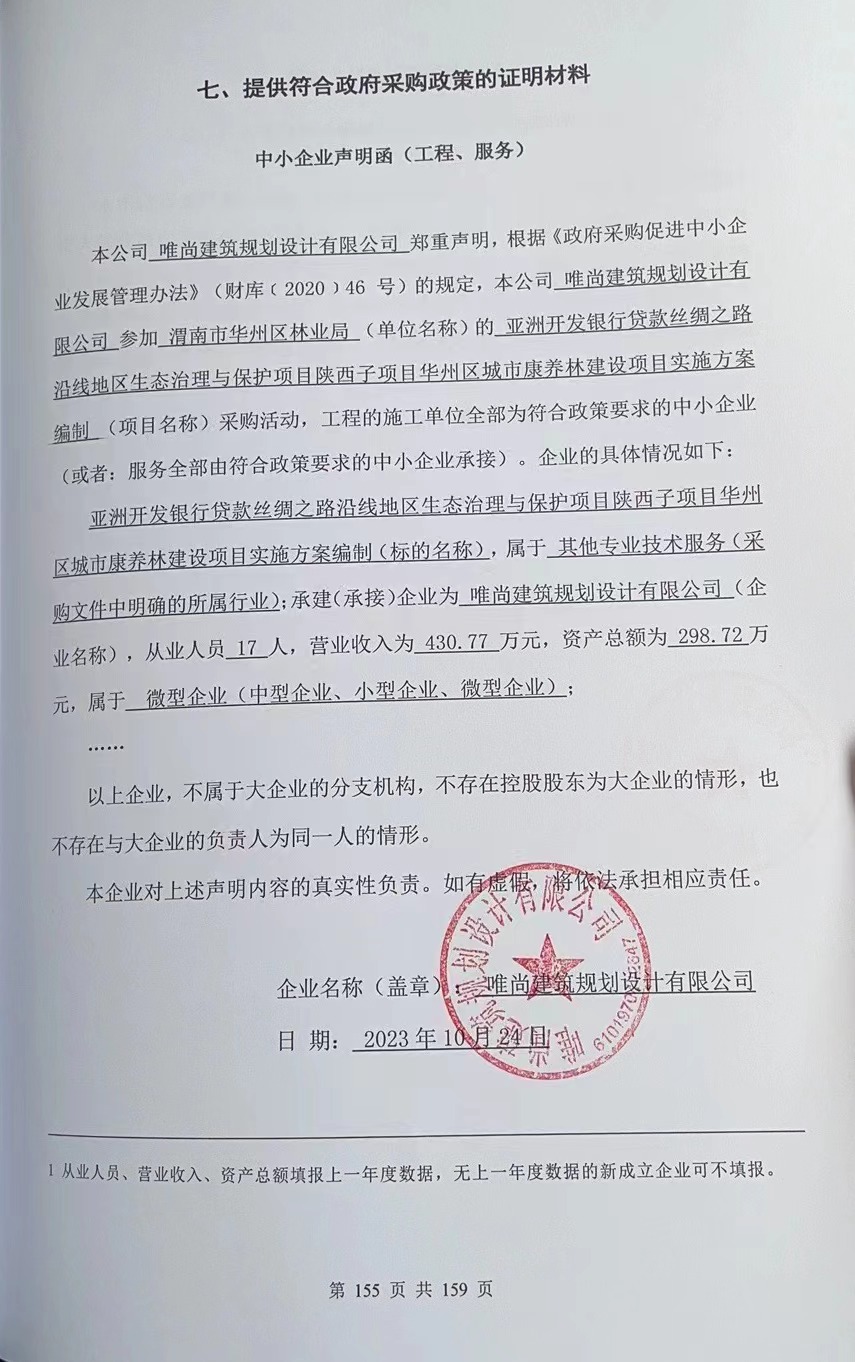 ----------------------------------招标机构发布信息原文:----------------------- 中小企业声明函.jpg 竞争性磋商文件-亚洲开发银行贷款丝绸之路沿线地区生态治理与保护项目陕西子项目华州区城市康养林建设项目实施方案编制.pdf 渭南市华州区林业局亚洲开发银行贷款丝绸之路沿线地区生态治理与保护项目陕西子项目华州区城市康养林建设项目实施方案编制中标(成交)明细.pdf 二次报价一览表.jpg 十一、其他事项: ------------------------------------招标信息结束---------------------------- 标签: 项目 陕西 中标 渭南市 林业局 州区 亚洲 上一篇: 2023年10月25日宜宾学院2023年纸质图书采购项目公开招标中标公告 最新5000条招标信息列表: 滚动招标 |