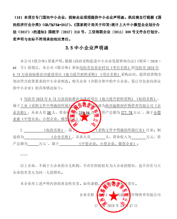 ----------------------------------招标机构发布信息原文:----------------------- 施格润中小声明.png 旬阳市农业农村局旬阳市2023年0.75万亩高标准农田建设项目(地力提升肥料采购)中标(成交)明细.pdf 十一、其他事项: ------------------------------------招标信息结束---------------------------- 标签: 采购 中标 旬阳 地力 农田 肥料 建设项目 上一篇: 2023年11月20日延安市药品检验所试剂耗材及仪器设备采购中标(成交)结果公告 最新5000条招标信息列表: 滚动招标 |