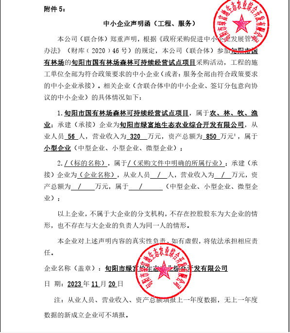 ----------------------------------招标机构发布信息原文:----------------------- 森林可持续经营试点项目招标文件(审定版)..pdf 企业声明函.png 旬阳市国有林场旬阳国有林场森林可持续经营试点项目中标(成交)明细.pdf 十一、其他事项: ------------------------------------招标信息结束---------------------------- 标签: 项目 中标 旬阳 林场 试点 森林 公告 上一篇: 2023年11月21日福建省立医院南院4K神经内镜脑室镜系统设备采购项目结果公告(采购包1) 最新5000条招标信息列表: 滚动招标 |