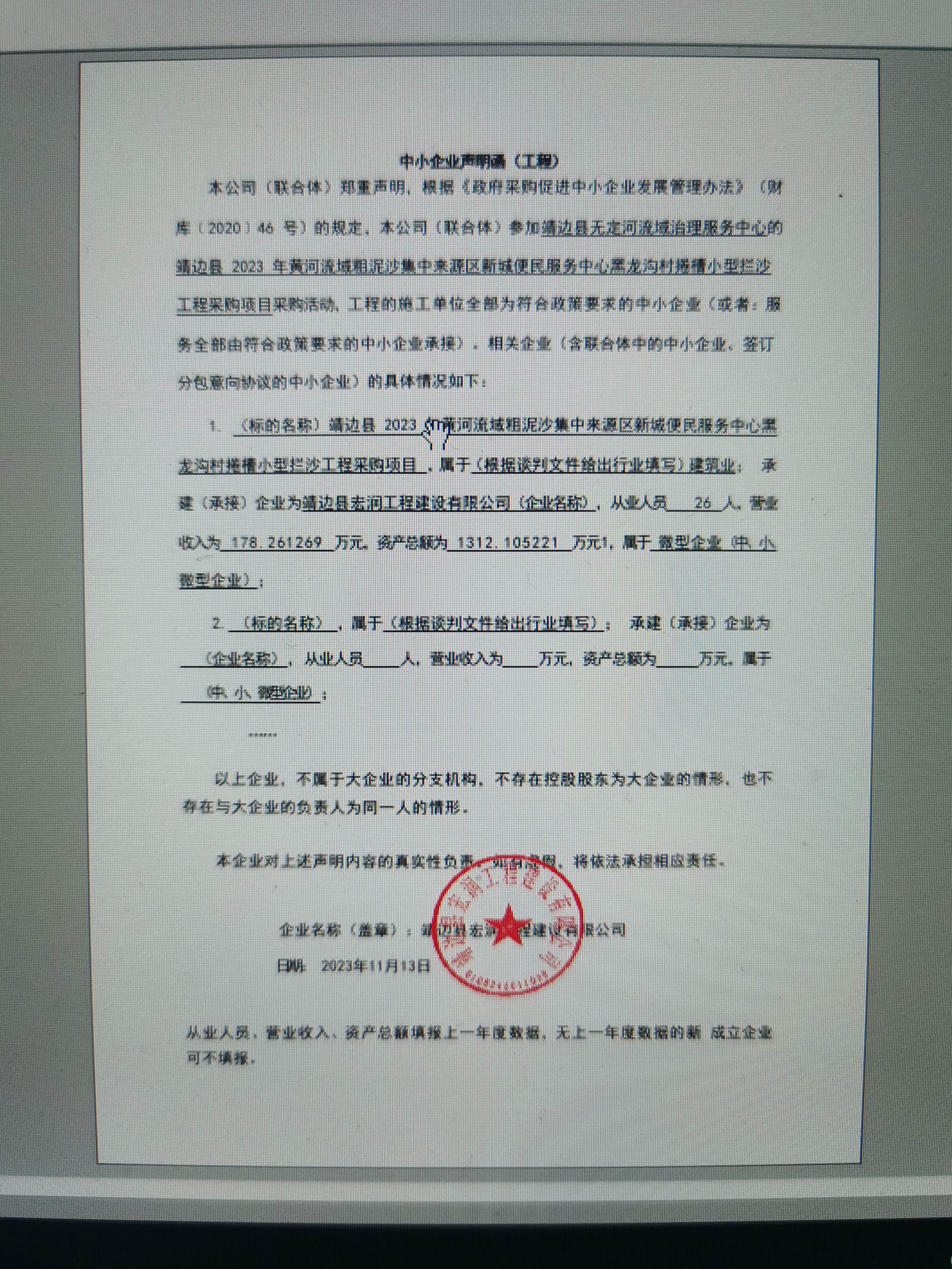2023年11月21日靖边县2023年黄河流域粗泥沙集中来源区新城便民服务中心黑龙沟村捲槽小型拦沙工程采购项目中标(成交)结果公告 |