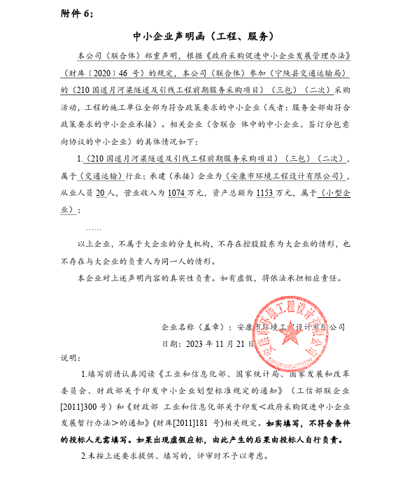 ----------------------------------招标机构发布信息原文:----------------------- 宁陕县交通局210国道月河梁隧道及引线工程前期服务采购项目(三包)(二次)中标(成交)明细.pdf 中标单位中小企业声明函.png GK2083 210国道月河梁隧道及引线工程前期服务采购项目(三包)(二次)-招标文件.pdf 十一、其他事项: ------------------------------------招标信息结束---------------------------- 标签: 项目 采购 中标 工程 宁陕县 引线 交通局 上一篇: 2023年11月22日哈尔滨市第二医院3.0T磁共振头颈联合线圈结果公告 最新5000条招标信息列表: 滚动招标 |