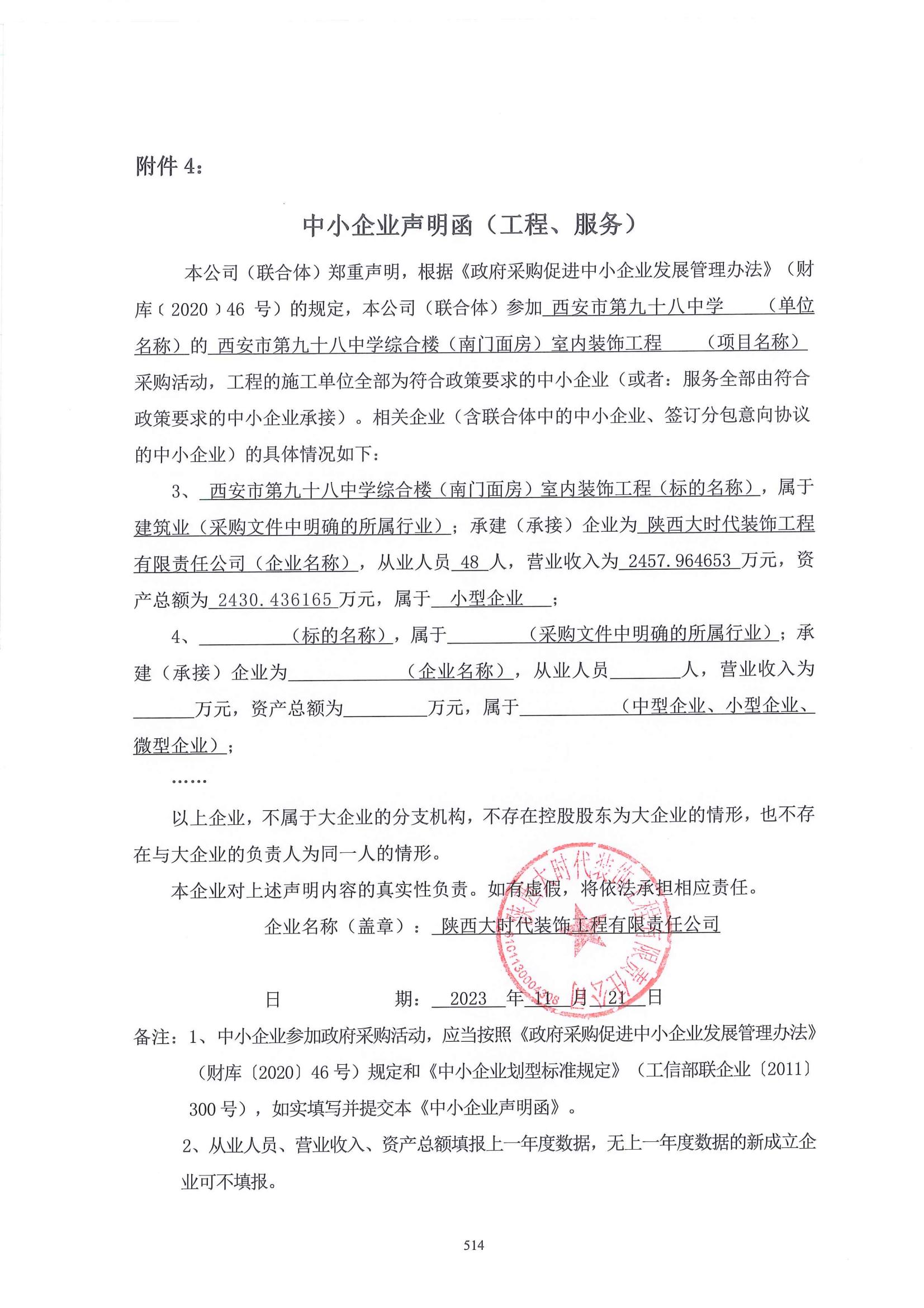 ----------------------------------招标机构发布信息原文:----------------------- 西安市第九十八中学综合楼(南门面房)室内装饰工程中标(成交)明细.pdf 中小企业声明函.jpg 二次报价表.pdf CS1091 西安市第九十八中学综合楼(南门面房)室内装饰工程(1).pdf 十一、其他事项: ------------------------------------招标信息结束---------------------------- 标签: 中标 西安市 综合楼 南门 装饰工程 室内 中学 上一篇: 2023年11月22日济南高新技术产业开发区临港街道办事处临港街道大码头村生活污水收集抽运服务项目成交公告 最新5000条招标信息列表: 滚动招标 |