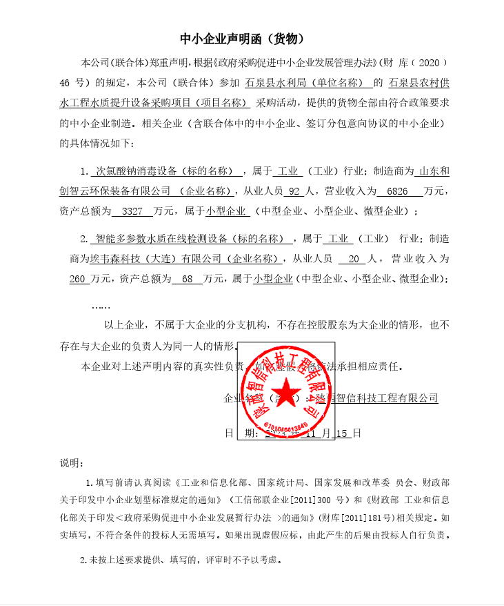 ----------------------------------招标机构发布信息原文:----------------------- 石泉县水利局石泉县农村供水工程水质提升设备采购项目中标(成交)明细.pdf 中小企业声明函.png GK2059 石泉县农村供水工程水质提升设备采购项目 招标文件(定稿版).pdf 十一、其他事项: ------------------------------------招标信息结束---------------------------- 标签: 中标 项目 石泉县 水利局 水质 设备采购 农村 上一篇: 2023年11月22日呼和浩特市自然资源局新城分局新城区村庄规划编制工作结果公告 最新5000条招标信息列表: 滚动招标 |