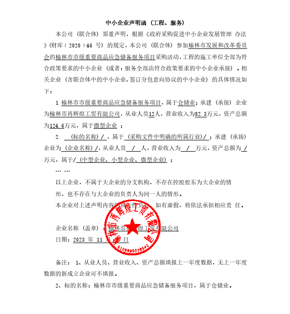 ----------------------------------招标机构发布信息原文:----------------------- 榆林市发展和改革委员会榆林市市级重要商品应急储备服务项目中标(成交)明细.pdf 中小企业声明函1.png 中小企业声明函2.png 十一、其他事项: ------------------------------------招标信息结束---------------------------- 标签: 中标 榆林市 市级 服务项目 改革委员会 公告 商品 上一篇: 2023年11月24日综合生活楼采暖维修改造项目竞争性磋商中标公告 最新5000条招标信息列表: 滚动招标 |