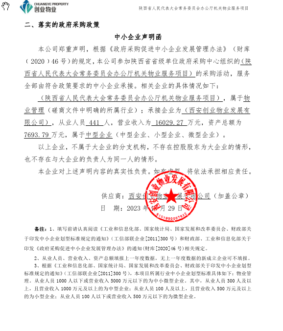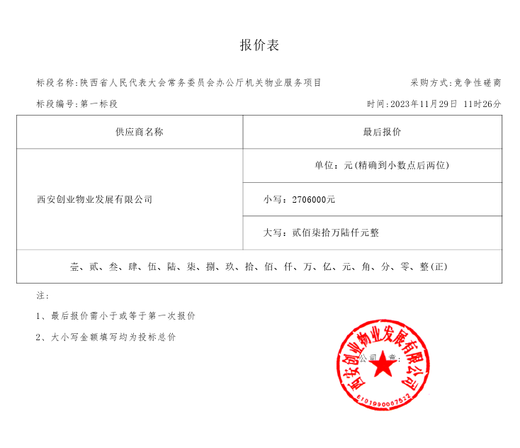 ----------------------------------招标机构发布信息原文:----------------------- 西安创业 中小企业声明函.png 陕西省人民代表大会常务委员会办公厅机关物业服务项目文件.pdf 陕西省人民代表大会常务委员会办公厅机关机关物业服务项目中标(成交)明细.pdf 西安创业 最终报价.png 十一、其他事项: ------------------------------------招标信息结束---------------------------- 标签: 中标 人民代表大会 陕西省 机关 办公厅 常务委员会 服务项目 上一篇: 2023年12月1日武汉市职业病防治院设备采购中标(成交)结果公告 最新5000条招标信息列表: 滚动招标 |