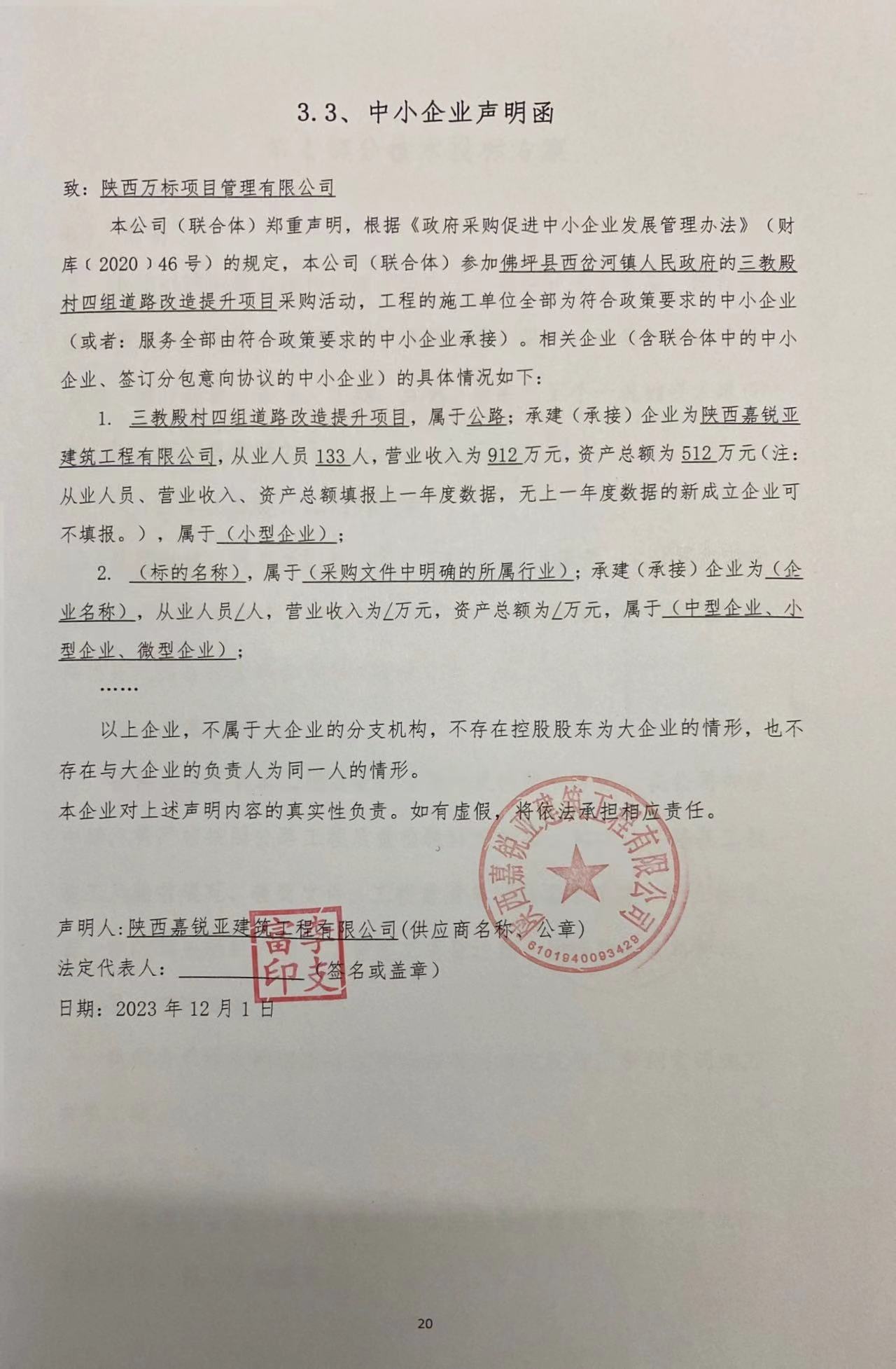 ----------------------------------招标机构发布信息原文:----------------------- 佛坪县西岔河镇人民政府三教殿村四组道路改造提升项目中标(成交)明细.pdf 三教殿村四组道路改造提升项目.pdf 中小企业声明函.jpg 十一、其他事项: ------------------------------------招标信息结束---------------------------- 标签: 中标 项目 四组 道路 公告 三教殿村 上一篇: 2023年12月4日西安市自然资源和规划局灞桥分局土地储备中心灞桥区集体土地所有权确权登记成果更新汇交项目中标(成交)结果公告 最新5000条招标信息列表: 滚动招标 |