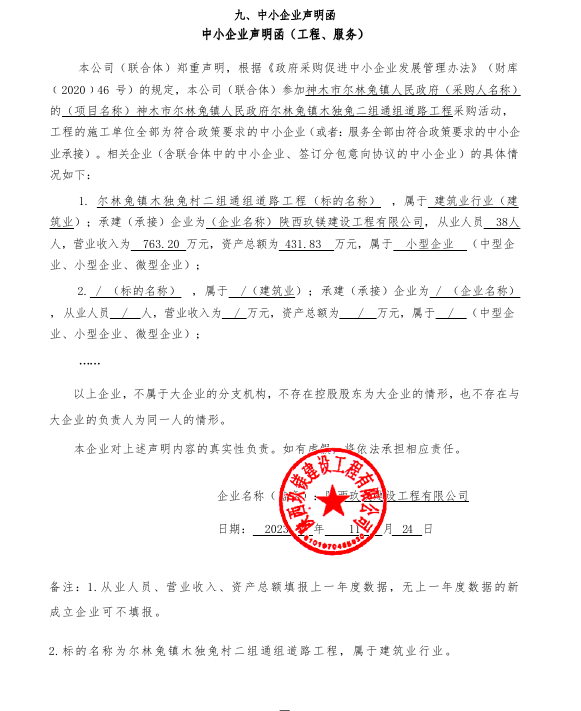 ----------------------------------招标机构发布信息原文:----------------------- 中小企业声明函(尔林兔独兔村道路).png 尔林兔镇木独兔村二组通组道路工程磋商文件(2023111401).zip 神木市尔林兔镇人民政府尔林兔镇木独兔村二组通组道路工程中标(成交)明细.pdf 十一、其他事项: ------------------------------------招标信息结束---------------------------- 标签: 工程 中标 神木 道路 公告 市尔林兔镇 尔林兔镇木独兔村二组通组 上一篇: 2023年12月4日凌云街道“低碳街区”创建项目中标公告 最新5000条招标信息列表: 滚动招标 |