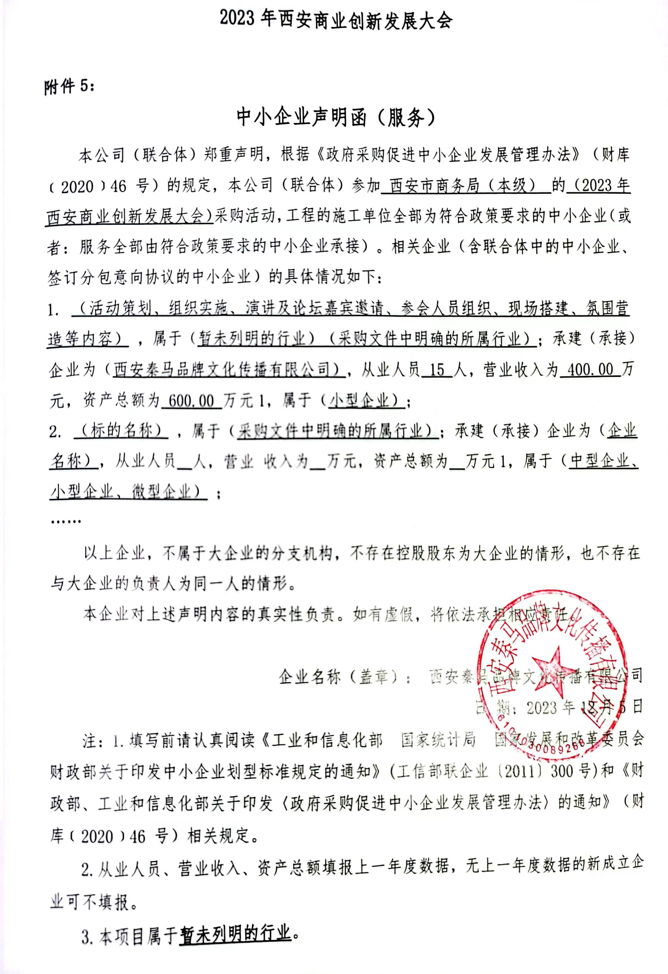 ----------------------------------招标机构发布信息原文:----------------------- 2023年西安商业创新发展大会.doc 中小企业声明函.jpg 西安市商务局(本级)2023年西安商业创新发展大会中标(成交)明细.pdf 十一、其他事项: ------------------------------------招标信息结束---------------------------- 标签: 中标 西安 大会 公告 商业 上一篇: 2023年12月6日冬至饺子节中标(成交)结果公告 最新5000条招标信息列表: 滚动招标 |