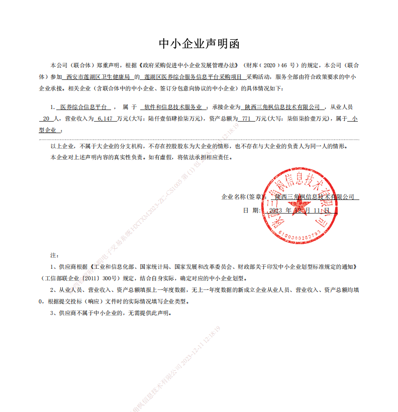 ----------------------------------招标机构发布信息原文:----------------------- 莲湖区医养综合服务信息平台采购项目报价明细附件.pdf 莲湖区医养综合服务信息平台采购项目-文件集.zip 报价表.jpg 中小企业声明函.png 十一、其他事项: ------------------------------------招标信息结束---------------------------- 标签: 采购 中标 项目 湖区 西安市 公告 平台 上一篇: 2023年12月13日仙桃市电化教育馆仙桃市电化教育馆学校视力防控设备购置项目中标(成交)结果公告 最新5000条招标信息列表: 滚动招标 |