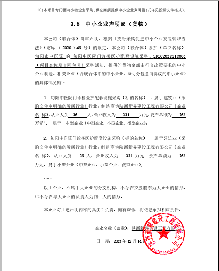 ----------------------------------招标机构发布信息原文:----------------------- 中小企业声明函(新昇).png 旬阳市中医院旬阳中医院门诊楼医护配套设施采购中标(成交)明细.pdf 十一、其他事项: ------------------------------------招标信息结束---------------------------- 标签: 采购 中标 旬阳 中医院 医护 门诊 设施 上一篇: 2023年12月18日《湛江市现代化海洋牧场建设规划(2023-2035年)》编制服务采购项目结果公告 最新5000条招标信息列表: 滚动招标 |