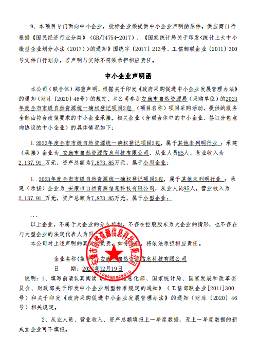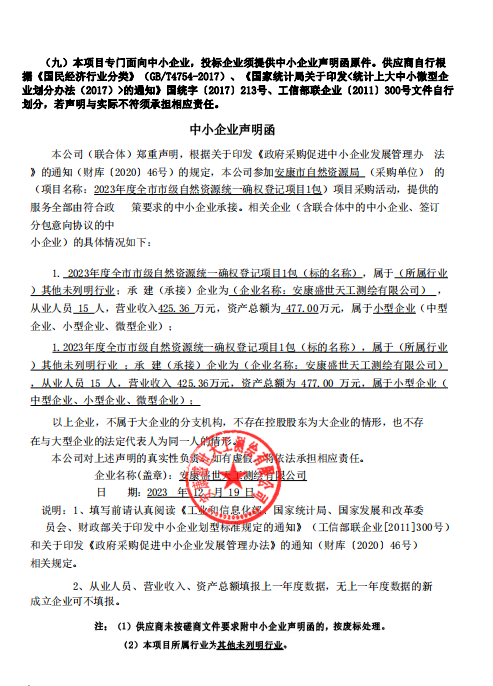 ----------------------------------招标机构发布信息原文:----------------------- 盛世天工中小企业声明.png 自然资源局信息科技有限公司中小企业声明函.png 安康市自然资源局2023年度全市市级自然资源统一确权登记项目中标(成交)明细.pdf 十一、其他事项: ------------------------------------招标信息结束---------------------------- 标签: 中标 项目 安康市 确权 市级 全市 年度 上一篇: 2023年12月20日武汉职业技术学院图书馆改扩建弱电智能化设计项目成交结果公告 最新5000条招标信息列表: 滚动招标 |