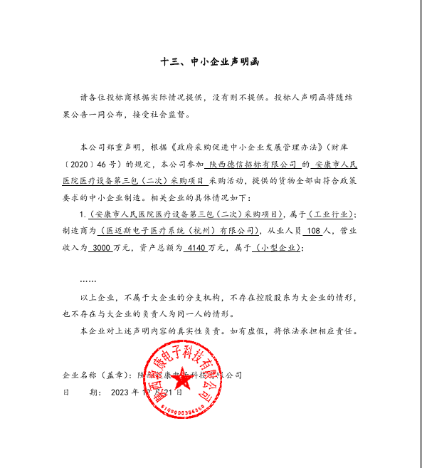 ----------------------------------招标机构发布信息原文:----------------------- 安康市人民医院医疗设备采购项目第三包(二次)中标(成交)明细.pdf (定稿)DXZB-2023-0854-3安康市人民医院医用设备采购项目.docx 中小企业声明函.png 十一、其他事项: ------------------------------------招标信息结束---------------------------- 标签: 中标 项目 安康市 三包 人民医院 设备采购 医疗 上一篇: 2023年12月22日汝湖镇甜玉米示范基地基础建设项目结果公告 最新5000条招标信息列表: 滚动招标 |