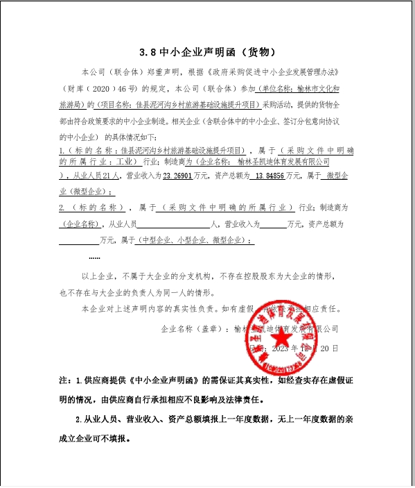 ----------------------------------招标机构发布信息原文:----------------------- 声明函.png 155榆林市文化和旅游局佳县泥河沟乡村旅游基础设施提升项目.docx 榆林市文化和旅游局佳县泥河沟乡村旅游基础设施提升项目中标(成交)明细.pdf 十一、其他事项: ------------------------------------招标信息结束---------------------------- 标签: 佳县 中标 项目 榆林市 旅游局 河沟 基础设施 上一篇: 2023年12月25日中烟物流技术有限责任公司卷烟厂厂内辅料智能化配送项目输送系统中标候选人公示 最新5000条招标信息列表: 滚动招标 |