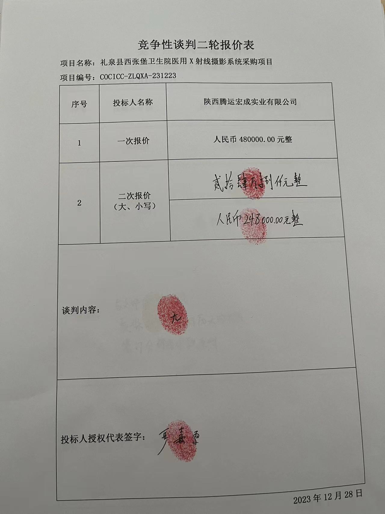 2023年12月29日咸阳市礼泉县西张堡卫生院礼泉县西张堡卫生院医用X射线摄影系统采购项目中标(成交)结果公告 |