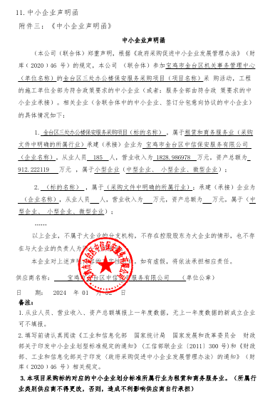 ----------------------------------招标机构发布信息原文:----------------------- 保安.png 宝鸡市金台区机关事务管理中心金台区三处办公楼保安服务采购项目中标(成交)明细.pdf 十一、其他事项: ------------------------------------招标信息结束---------------------------- 标签: 项目 中标 采购 办公楼 保安 三处 公告 上一篇: 2024年1月3日业州镇乐家坝村党员群众活动中心提档升级项目中标成交公告 最新5000条招标信息列表: 滚动招标 |