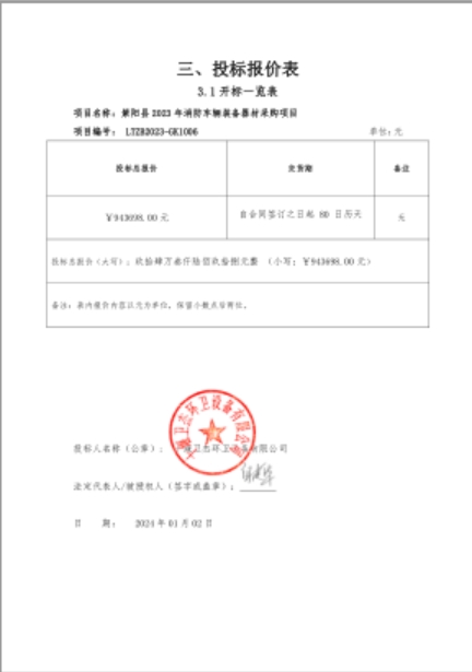 ----------------------------------招标机构发布信息原文:----------------------- GK1006【定稿】消防车辆装备器材采购(1).pdf 中小企业声明函.pdf 紫阳县应急管理局紫阳县2023年消防车辆装备器材采购项目中标(成交)明细.pdf 开标一览表.png 十一、其他事项: ------------------------------------招标信息结束---------------------------- 标签: 采购 中标 项目 紫阳县 车辆 器材 装备 上一篇: 2024年1月4日上海音乐学院物业管理服务费的中标(成交)结果公告 最新5000条招标信息列表: 滚动招标 |