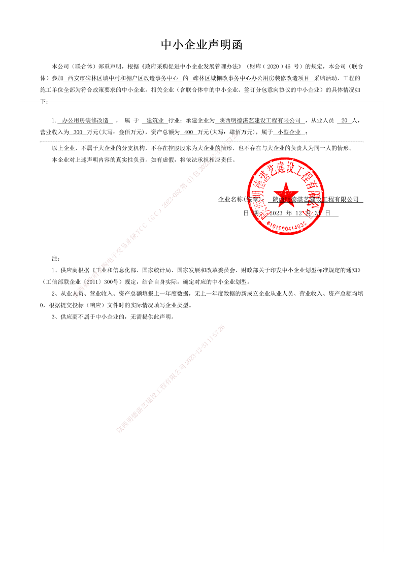 ----------------------------------招标机构发布信息原文:----------------------- 碑林区城棚改事务中心办公用房装修改造项目报价明细附件.pdf 中小企业声明函.png 碑林区城棚改事务中心办公用房装修改造项目磋商文件(1227104631).pdf 十一、其他事项: ------------------------------------招标信息结束---------------------------- 标签: 中标 碑林 西安市 事务 棚户区 办公用房 中心 上一篇: 2024年1月4日应城市公路局2023年应城市S212宋天线、S262万杨线路面养护中修工程及应城市南德线(G347)王家中桥加固改造工程应城市南德线(G347)高家垱桥改造工程EPC项目中标公告 最新5000条招标信息列表: 滚动招标 |