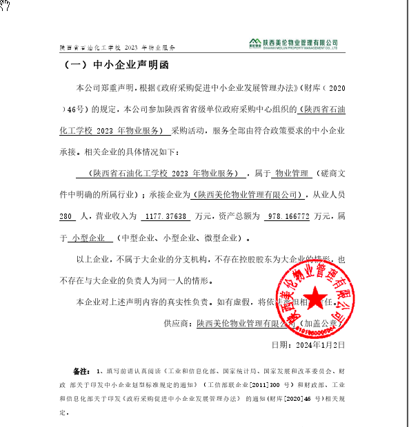 ----------------------------------招标机构发布信息原文:----------------------- 陕西美伦物业管理有限公司中小企业声明函.png 陕西省石油化工学校2023年物业服务中标(成交)明细.pdf 陕西美伦物业管理有限公司报价表.png 十一、其他事项: ------------------------------------招标信息结束---------------------------- 标签: 中标 陕西省 石油化工 物业服务 学校 公告 上一篇: 2024年1月8日肇庆市第一人民医院(肇庆市医疗紧急救援中心)中心机房信息设备维护保养项目结果公告 最新5000条招标信息列表: 滚动招标 |