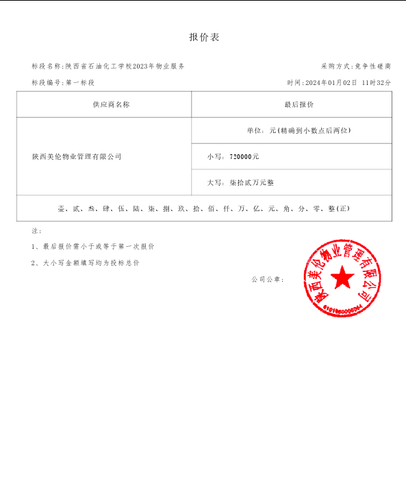 2024年1月8日陕西省石油化工学校2023年物业服务中标(成交)结果公告 |