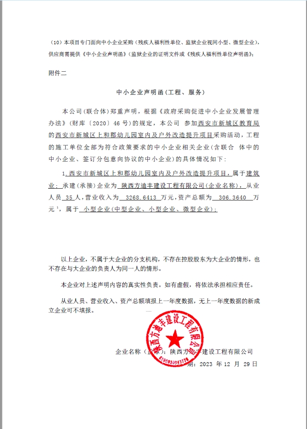 ----------------------------------招标机构发布信息原文:----------------------- 西安市新城区教育局西安市新城区上和郡幼儿园室内及户外改造提升项目中标(成交)明细.pdf 1598-西安市新城区上和郡幼儿园室内及户外改造提升项目-招标文件-定稿.doc 小微企业声明函.png 十一、其他事项: ------------------------------------招标信息结束---------------------------- 标签: 西安 幼儿园 项目 中标 市新 城区 教育局 上一篇: 2024年1月8日物业管理-3保安服务采购项目中标公告 最新5000条招标信息列表: 滚动招标 |
