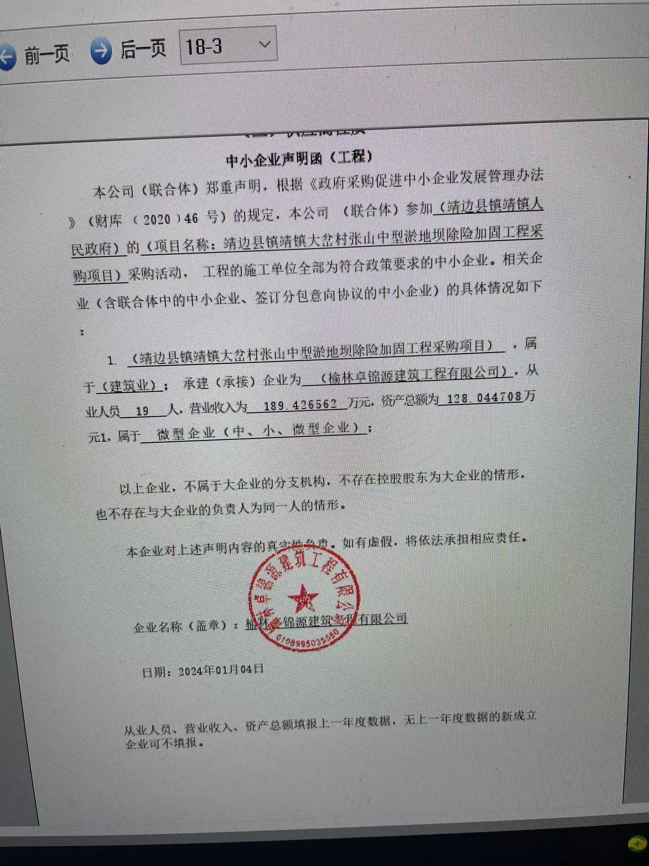 ----------------------------------招标机构发布信息原文:----------------------- 卓锦源中小企业声明函.jpg 靖边县镇靖镇人民政府靖边县镇靖镇大岔村张山中型淤地坝除险加固工程采购项目中标(成交)明细.pdf 十一、其他事项: ------------------------------------招标信息结束---------------------------- 标签: 项目 采购 工程 中标 靖边县 山中 公告 上一篇: 2024年1月10日嘉兴市华信工程咨询有限公司关于2024-2025年度秀洲区县道及以上公路日常养护项目中标(成交)结果公告 最新5000条招标信息列表: 滚动招标 |