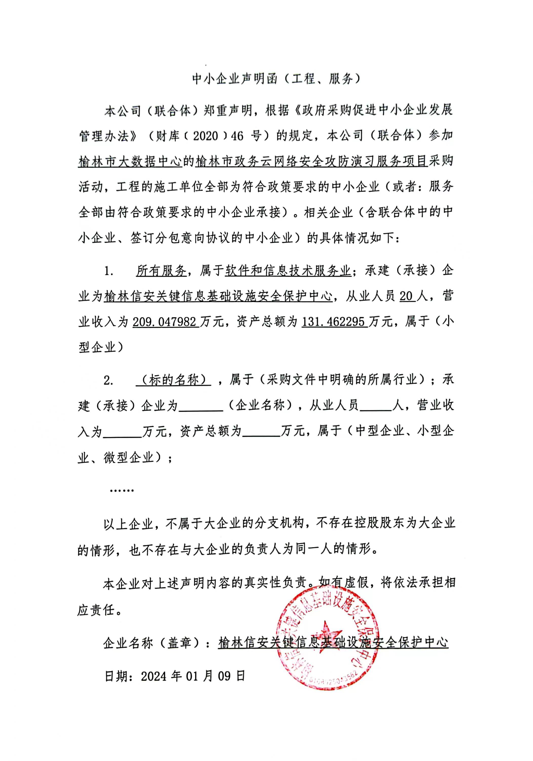 ----------------------------------招标机构发布信息原文:----------------------- 中小企业声明函.jpg 榆林市大数据中心榆林市政务云网络安全攻防演习服务项目中标(成交)明细.pdf 十一、其他事项: ------------------------------------招标信息结束---------------------------- 标签: 中标 榆林市 攻防 服务项目 政务 云网 公告 上一篇: 2024年1月15日郑州市生态供水保障中心2024年维修养护服务项目-中标公告 最新5000条招标信息列表: 滚动招标 |