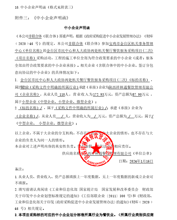 ----------------------------------招标机构发布信息原文:----------------------- 中小企业声明函.png 宝鸡市金台区机关事务管理中心金台区市民中心和人大政协两处机关餐厅餐饮服务采购项目(二次)中标(成交)明细.pdf 十一、其他事项: ------------------------------------招标信息结束---------------------------- 标签: 项目 中标 采购 两处 政协 餐饮服务 餐厅 上一篇: 2024年1月17日岚皋县2023年度秦岭松材线虫病防控补偿资金树干注药项目中标(成交)结果公告 最新5000条招标信息列表: 滚动招标 |