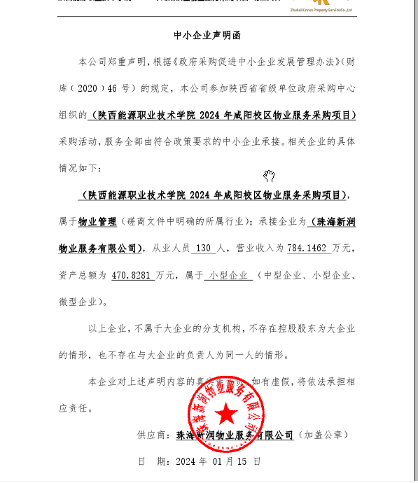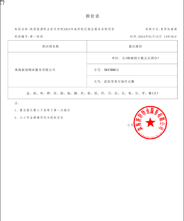 ----------------------------------招标机构发布信息原文:----------------------- 珠海新润物业服务有限公司中小企业声明函.png 陕西能源职业技术学院2024年咸阳校区物业服务采购项目中标(成交)明细.pdf 珠海新润物业服务有限公司报价表.png 十一、其他事项: ------------------------------------招标信息结束---------------------------- 标签: 项目 采购 陕西 中标 职业技术学院 校区 物业服务 上一篇: 2024年1月17日成都市妇女儿童中心医院(成都市妇幼保健院、成都市妇产科医院、成都市儿童医院)医院品牌宣传服务采购项目(二次)竞争性磋商成交公告 最新5000条招标信息列表: 滚动招标 |