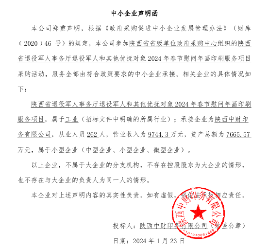 ----------------------------------招标机构发布信息原文:----------------------- 陕西中财印务有限公司中小企业声明函.png 陕西省退役军人事务厅机关退役军人和其他优抚对象2024年春节慰问年画印刷服务项目中标(成交)明细.pdf 陕西中财印务有限公司分项报价表.pdf 十一、其他事项: ------------------------------------招标信息结束---------------------------- 标签: 中标 军人 陕西省 年画 服务项目 对象 机关 上一篇: 2024年1月25日四川省妇幼保健院省级妇幼健康实践技能培训中心建设危重孕产妇救治实践技能培训设备项目公开招标中标公告 最新5000条招标信息列表: 滚动招标 |