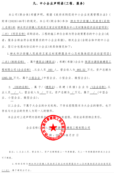 ----------------------------------招标机构发布信息原文:----------------------- 沙峁镇王家庄村党群服务中心及村集体经济活动室项目(二次)磋商文件(2024010502).zip 神木市沙峁镇人民政府沙峁镇王家庄村党群服务中心及村集体经济活动室项目(二次)中标(成交)明细.pdf 中小企业声明函.png 十一、其他事项: ------------------------------------招标信息结束---------------------------- 标签: 项目 中标 神木 党群 王家 庄村 服务中心 上一篇: 2024年1月25日东营区2024年度防贫保险项目中标(成交)公告 最新5000条招标信息列表: 滚动招标 |