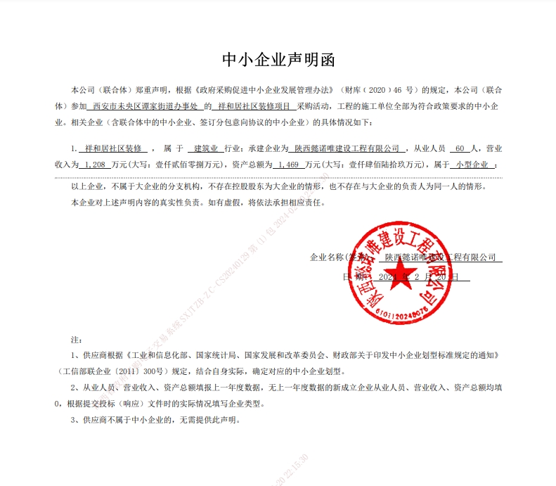 ----------------------------------招标机构发布信息原文:----------------------- 祥和居社区装修项目报价明细附件.pdf 祥和居社区装修项目-文件集.zip 中小企业声明函.png 报价.png 十一、其他事项: ------------------------------------招标信息结束---------------------------- 标签: 中标 项目 西安市 街道办事处 装修 公告 社区 上一篇: 2024年2月22日广平县残疾人基本康复服务项目竞争性磋商中标公告 最新5000条招标信息列表: 滚动招标 |